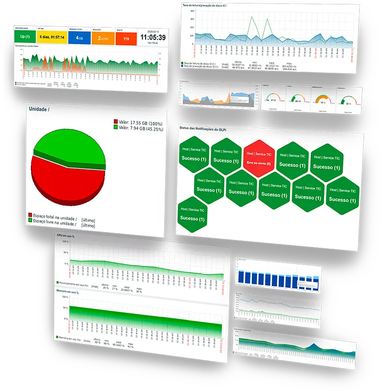 Também oferecemos soluções completas de monitoramento e observabilidade, combinando o poder do Zabbix e do Grafana para entregar dashboards em tempo real, que acompanham a saúde da sua infraestrutura e dos processos mais críticos.