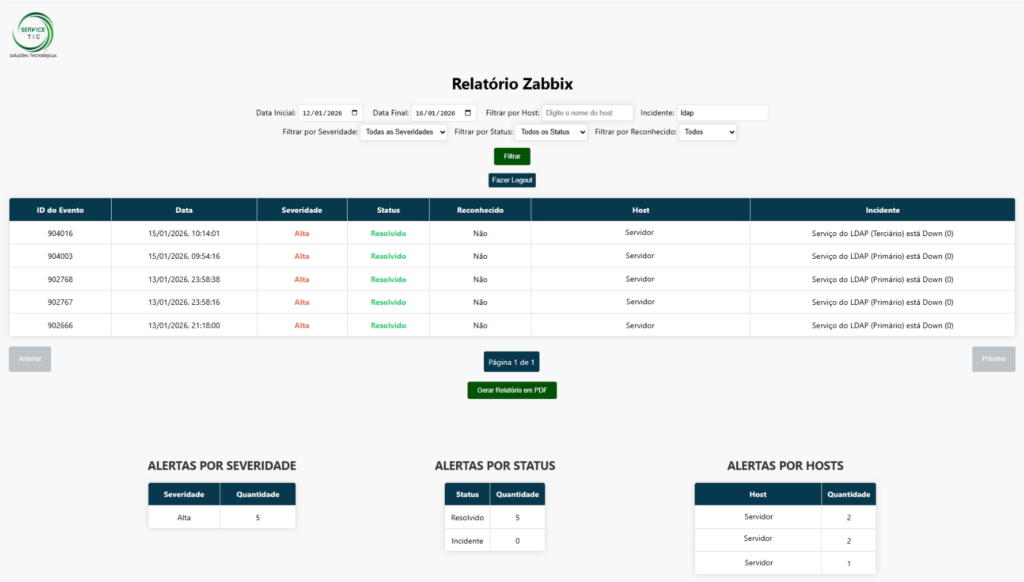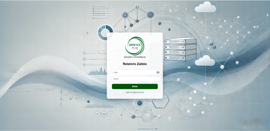 Desenvolvemos um container Docker com relatório do Zabbix via API, pensado para simplificar o acesso às informações de monitoramento e permitir a exportação de relatórios em PDF, de forma prática, segura e rápida. Ele conecta diretamente à API do Zabbix, coleta os dados de monitoramento e apresenta relatórios práticos por meio de uma interface web: